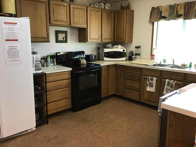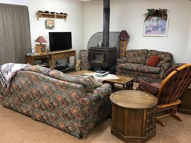 The main room is complete with a living area wood stove, dining area and fully stocked kitchen with all utensils and appliances needed for preparing meals. Two refrigerators are available for use.