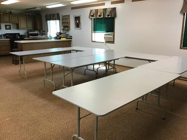 Rather-Be's Retreat Center features a large workroom complete with work tables, office chairs, table risers, cutting boards, irons and ironing boards. The daylight basement and ceiling lighting enhances the work area.